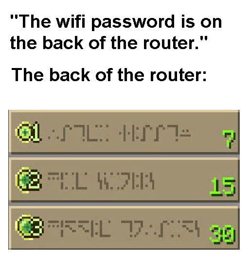Password on the back of the router refers to parody images imitating the indecipherable passwords that are typically listed on the back of wi fi routers.